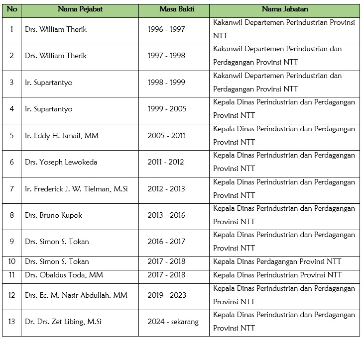 - Di awal penggabungan tersebut, Gubernur Nusa Tenggara Timur -Bapak Herman Musakabe- melantik Drs. William Therik -Kakanwil Departemen Perindustrian Provinsi NTT- sebagai Kepala Kantor Wilayah Departemen Perindustrian dan Perdagangan Provinsi NTT. Pada tahun 1998, Ir. Supartantyo dilantik sebagai Kakanwil Departemen Perindustrian dan Perdagangan Provinsi NTT menggantikan Drs. William Therik.